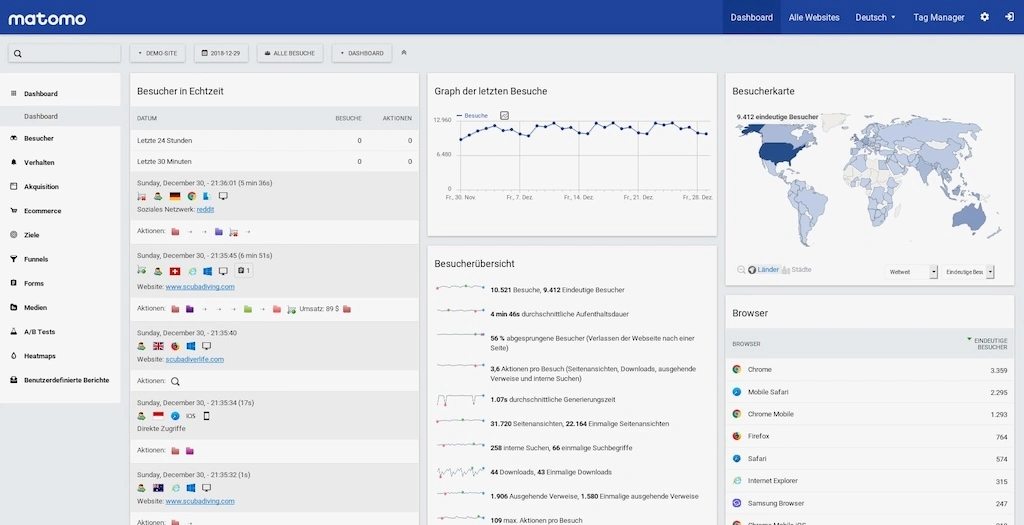 - Echtzeit-Analysen: Matomo bietet detaillierte Echtzeit-Statistiken, die wertvolle Einblicke in das Besucherverhalten und die Leistung der Website geben.