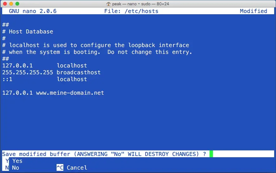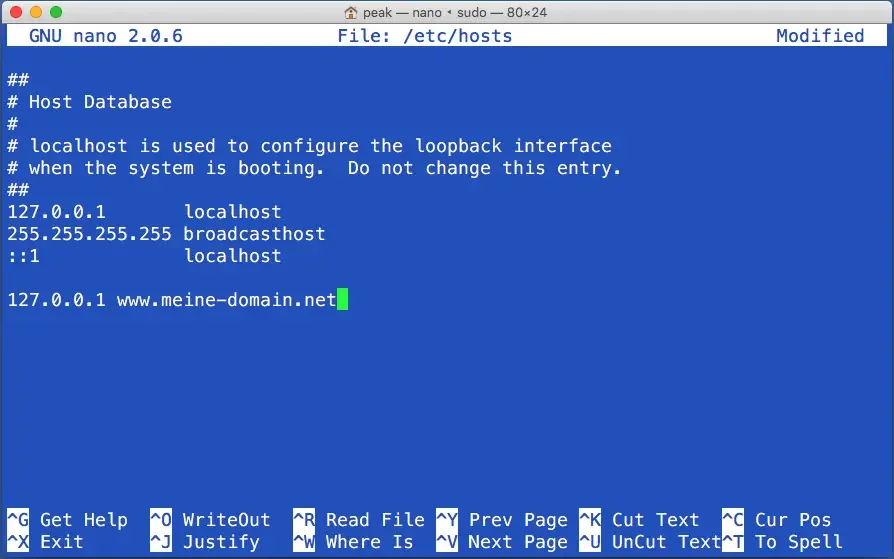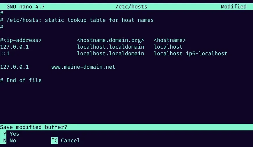 3. Sie befinden sich nun im Texteditor. navigieren Sie mit den Pfeiltasten nach unten und geben Sie Ihren gewünschten Hosts-Eintrag ein. In diesem Falle zeigt nun die IP «127.0.0.1» auf die Domain «www.meine-domain.net». Nachdem Sie den Eintrag hinzugefügt haben, drücken Sie die Tastaturkombination: «Strg + X».