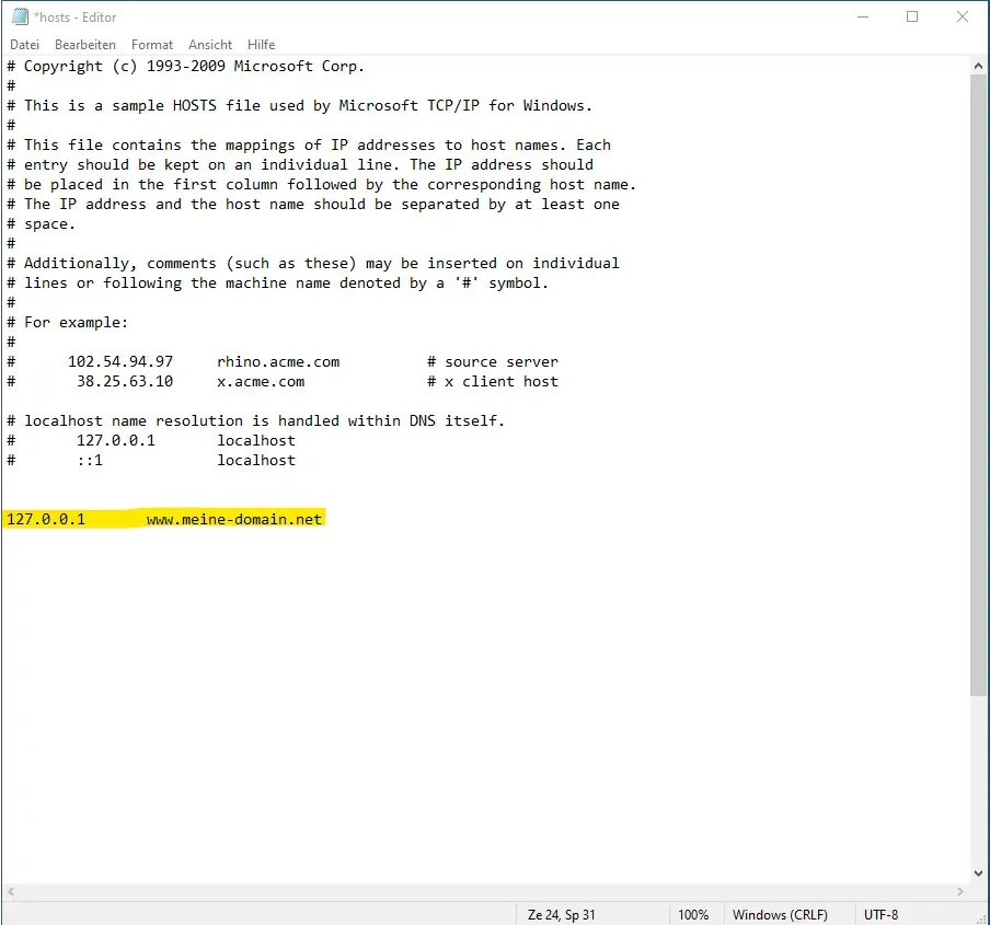4. Nun haben Sie die Datei offen und können Ihren Host-Eintrag hinzufügen. In diesem Falle zeigt nun die IP «127.0.0.1» auf die Domain «www.meine-domain.net»