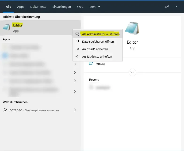 Anschließend klicken Sie auf den Editor mit der rechten Maustaste und klicken Sie links auf «Als Administrator ausführen».